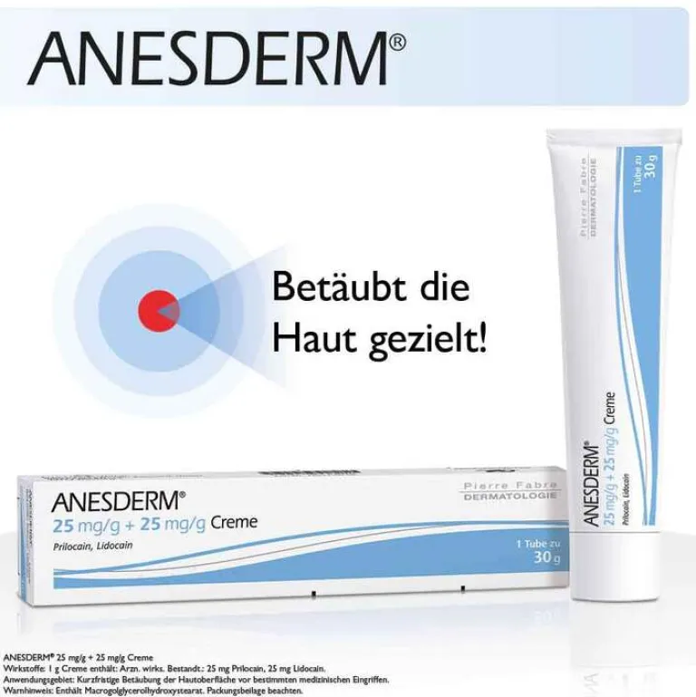 ANESDERM® 25 mg/g + 25 mg/g Creme Wirkstoffe: 1 g Creme enthält: Arzn. wirks. Bestandt.: 25 mg Prilocain, 25 mg Lidocain. Anwendungsgebiet: Kurzfristige Betäubung der Hautoberfläche vor bestimmten medizinischen Eingriffen. Warnhinweis: Enthält Macrogolglycerolhydroxystearat. Packungsbeilage beachten. Zu Risiken und Nebenwirkungen lesen Sie die Packungsbeilage und fragen Sie Ihre Ärztin, Ihren Arzt oder in Ihrer Apotheke. Stand 8 – 2023
