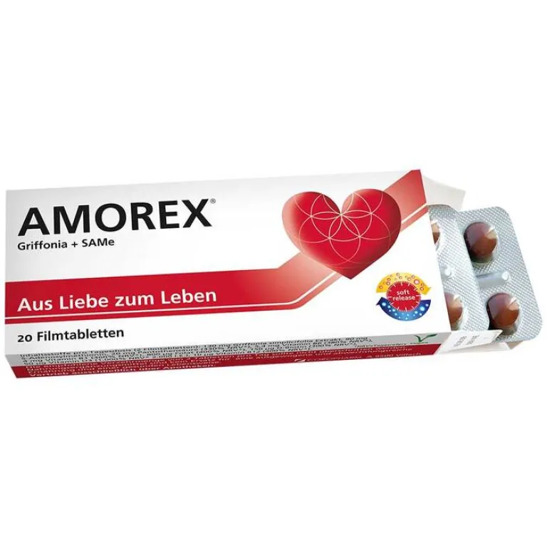 Empfohlene Tagesdosis: 2 Tabletten. Je 1 Amorex Griffonia + SAMe Filmtablette morgens vor dem Essen und abends vor dem Schlafengehen.