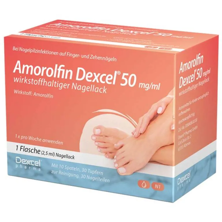 Amorolfin Dexcel® 50 mg/ml wirkstoffhaltiger Nagellack. Wirkstoff: Amorolfin. Anwendungsgebiete: Behandlung von Pilzerkrankungen der Nägel (Onychomykose) ohne Beteiligung der Nagelwurzel (Nagelmatrix). Hinweis: 1x wöchentlich auf die befallenen Finger- oder Fußnägel auftragen. Zu Risiken und Nebenwirkungen lesen Sie die Packungsbeilage und fragen Sie Ihre Ärztin, Ihren Arzt oder in Ihrer Apotheke. Dexcel Pharma GmbH, 63755 Alzenau. Stand: Juli 2021