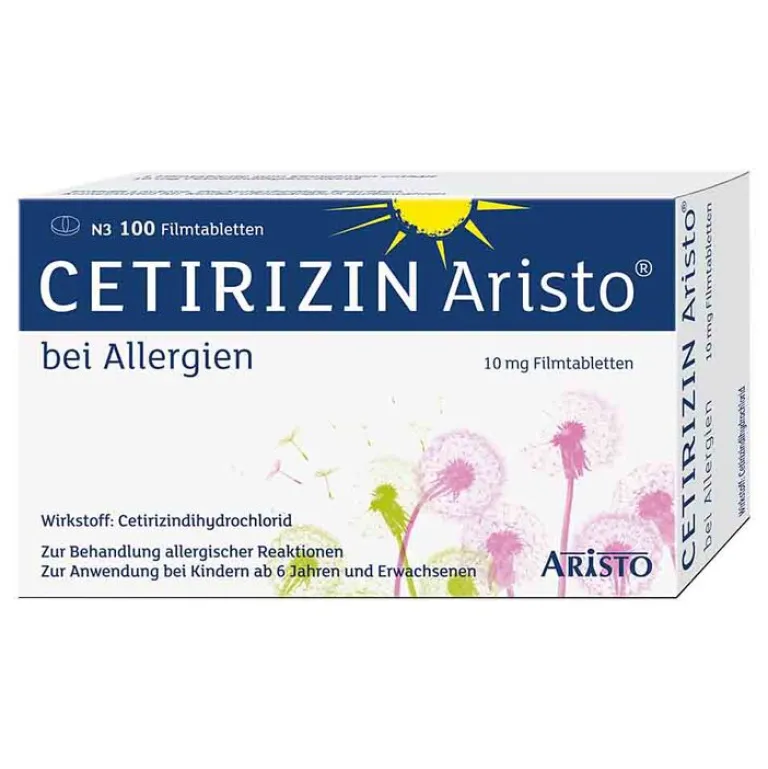 Cetirizin Aristo® bei Allergien, 10 mg Filmtabletten Wirkstoff: Cetirizindihydrochlorid. Kdr. ab 6 J. u. Erwachs.: Behandlung v. Krankheitszeichen (Symptomen) bei allerg. Erkrankungen wie chron. Nesselsucht (Urtikaria) (mit z. B. Juckreiz, Quaddelbildung, Haut-Rötung); chron. allerg. Schnupfen; Juckreiz bei Nesselsucht (Urtikaria) u. atopischer Dermatitis (Neurodermitis) mit Beschwerden wie Rötung der Haut; Heuschnupfen (mit z. B. Niesen, Nasenlaufen, Nasenjucken, Nasenverstopfung, Rötung bzw. Jucken der Augen u. Tränenfluss); z. Unterstützung b. asthmoiden Zuständen allerg. Herkunft. Enthält Lactose. Packungsbeilage beachten. Zu Risiken und Nebenwirkungen lesen Sie die Packungsbeilage und fragen Sie Ihre Ärztin, Ihren Arzt oder in Ihrer Apotheke. Apothekenpflichtig. (Stand November 2023). Aristo Pharma GmbH, Wallenroder Straße 8-10, 13435 Berlin.