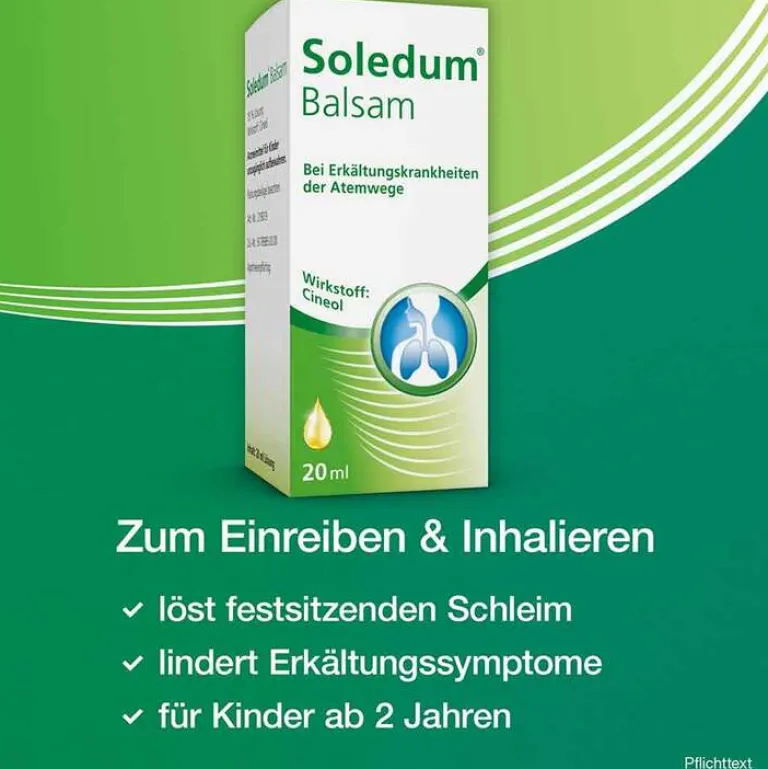 Soledum® Balsam Wirkstoff: Cineol. Anwendungsgebiete: Zur Verbesserung des Befindens bei Erkältungskrankheiten der oberen und unteren Atemwege (wie unkomplizierter Schnupfen, Heiserkeit, unkomplizierter Bronchialkatarrh, unkomplizierter Nasennebenhöhlenkatarrh). Soledum® Balsam ist ausschließlich für die äußere Anwendung (Inhalation, Einreibung) vorgesehen. Nicht zum Einnehmen. Wenn Sie sich nach 7 Tagen nicht besser oder gar schlechter fühlen, wenden Sie sich an Ihren Arzt. Zu Risiken und Nebenwirkungen lesen Sie die Packungsbeilage und fragen Sie Ihre Ärztin, Ihren Arzt oder in Ihrer Apotheke.