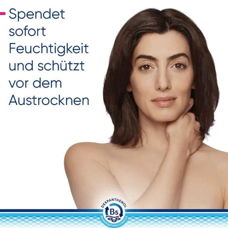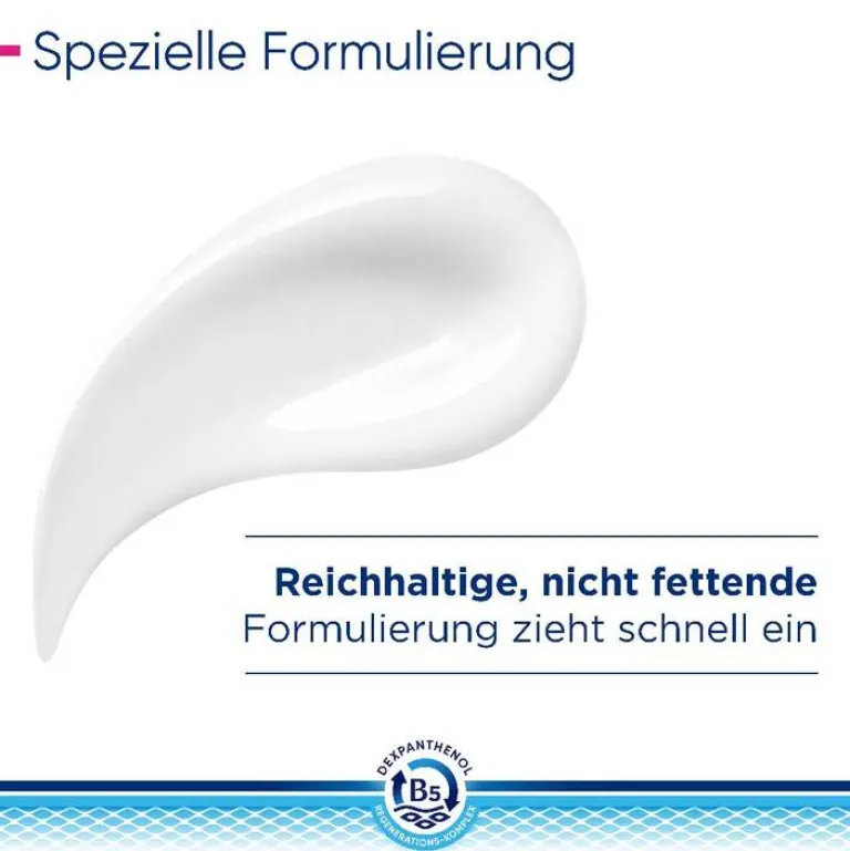 Der B5-Regenerations-Komplex unterstützt die Regeneration der Haut – von innen nach außen. Dabei fördert Dexpanthenol in tieferen Hautschichten der Epidermis die natürliche Zellregeneration. Das enthaltene Glycerin spendet sofortige und lang anhaltende Feuchtigkeit. Niacinamid (Vitamin B3) beruhigt juckende, trockene Haut und natürliche Lipide wie Sheabutter und Arganöl ergänzen fehlende Hautlipide. Das physiologische Lipid unterstützt zusätzlich die Anordnung der Doppellipidschicht.