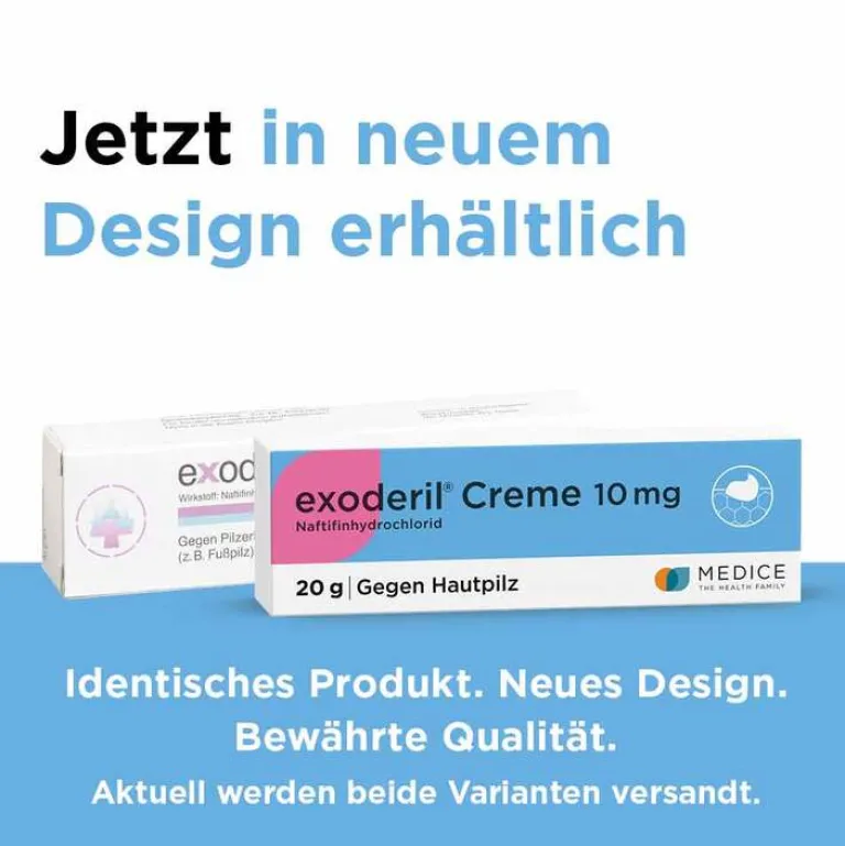 exoderil® Creme 10 mg; Anwendungsgebiete: Pilzinfektionen der Haut (Dermatomykosen), verursacht durch Dermatophyten, Hefe und Schimmelpilze sowie Mischinfektionen mit Bakterien. Warnhinweise: Enthält Stearylalkohol und Cetylalkohol. Nicht in die Augen bringen. Zu Risiken und Nebenwirkungen lesen Sie die Packungsbeilage und fragen Sie Ihre Ärztin, Ihren Arzt oder in Ihrer Apotheke; 02/2018