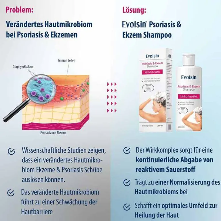 Evolsin® Ekzem & Psoriasis Shampoo reduziert Juckreiz und beruhigt gereizte Kopfhaut bei verschiedenen Hauterkrankungen wie Psoriasis/ Schuppenflechte, Ekzemen und Neurodermitis.