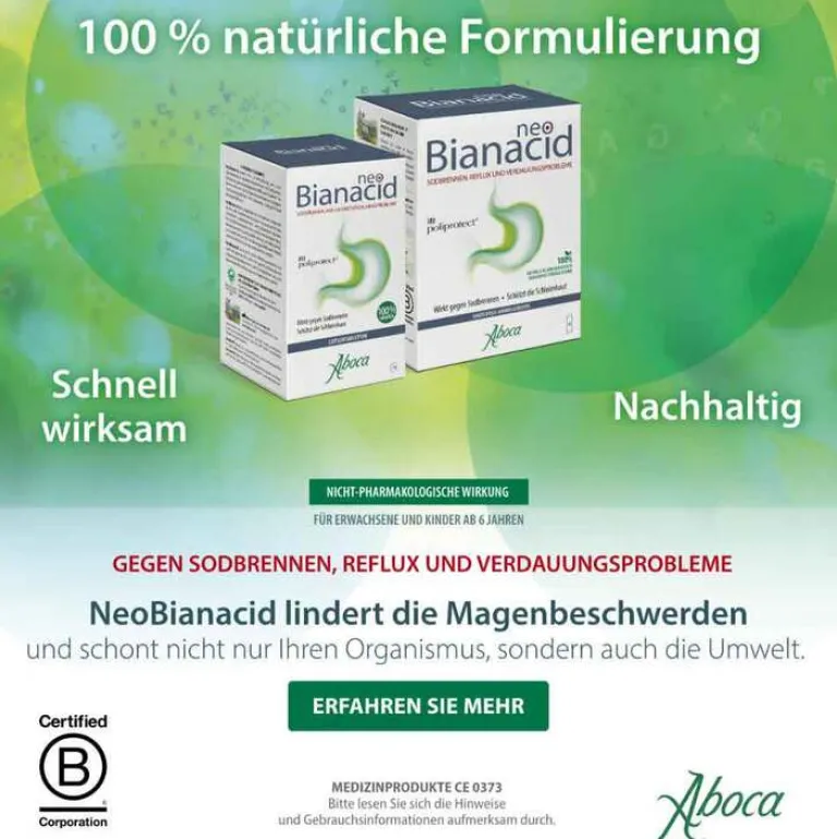 NeoBianacid ist ein speziell entwickeltes Produkt, das Sodbrennen lindert und gleichzeitig die Schleimhaut des Magens und der Speiseröhre schützt. Es enthält Poliprotect – einen Molekülkomplex mit mucoadhäsiven Eigenschaften. Diese Eigenschaften ermöglichen es, eine Schutzbarriere auf der Schleimhaut zu bilden, die sie vor Magensäure und anderen reizenden Substanzen schützt. NeoBianacid ist als Lutschtablette erhältlich und enthält Mineralien (Kalkstein und Nahkolit), Polysaccharide aus Aloe Vera, Malve und Eibisch sowie Flavonoide aus Kamille und Süßholz.