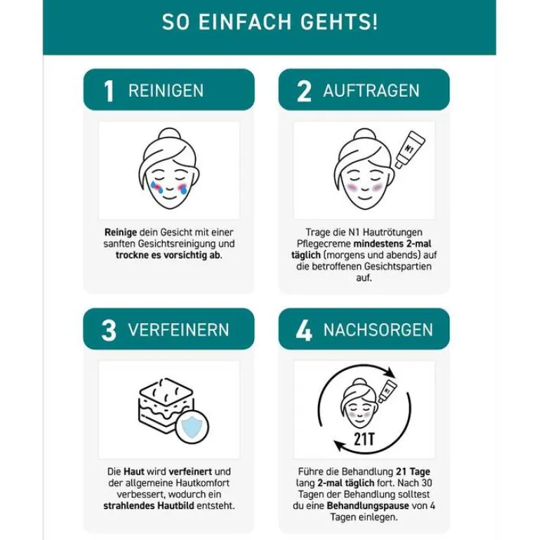 Tragen Sie die Pflegecreme zweimal täglich auf die gereinigte Haut auf.