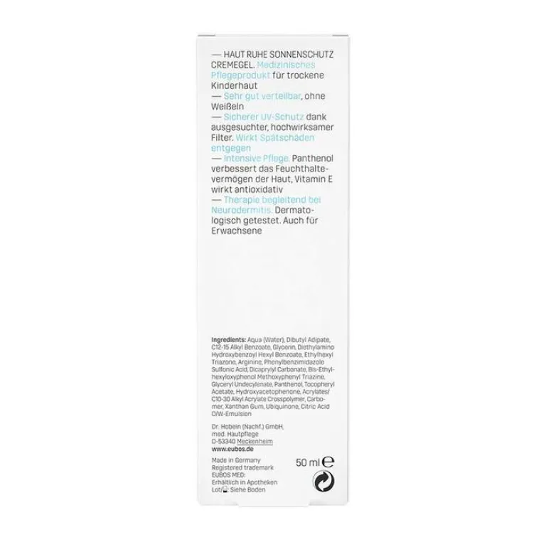 Eubos Kinder Haut Ruhe Sonnenschutz Creme-Gel LSF 30 + UVA ist ein medizinisches Pflegeprodukt für trockene Kinderhaut. Es lässt sich sehr gut verteilen, ohne zu weißeln. Das Produkt bietet einen sicheren UV-Schutz dank ausgesuchter hochwirksamer Filter. Es beugt Spätschäden vor und pflegt intensiv. Panthenol verbessert das Feuchthaltevermögen der Haut, Vitamin E ist antioxidativ. Eubos Kinder Haut Ruhe Sonnenschutz Creme-Gel LSF 30 + UVA kann Therapie begleitend bei Neurodermitis angewendet werden. Das Creme-Gel wurde dermatologisch getestet und eignet sich auch für Erwachsene.