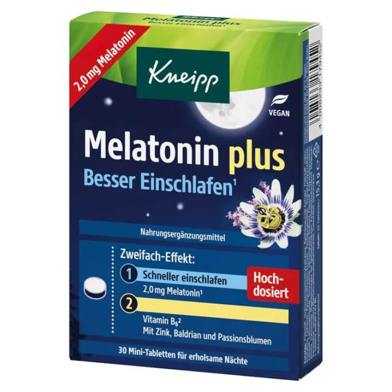 - Nahrungsergänzungsmittel mit Melatonin, Vitamin B6, Zink, Baldrianwurzel- und Passionsblumen-Extrakt