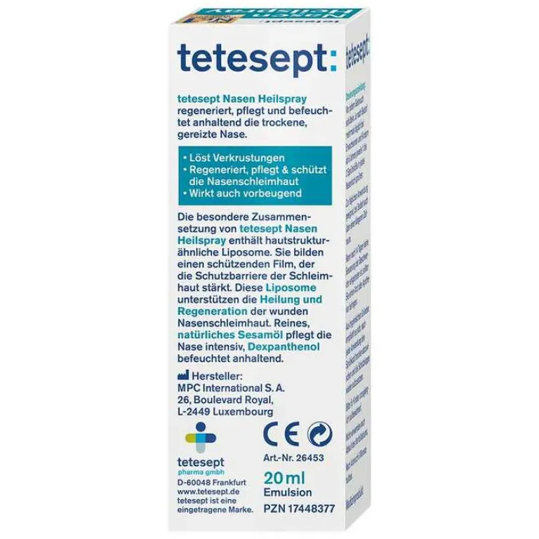 Die besondere Zusammensetzung von tetesept Nasen Heilspray enthält hautstrukturähnliche Liposome. Sie bilden einen schützenden Film, der die Schutzbarriere der Schleimhaut stärkt. Diese Liposome unterstützen die Heilung und Regeneration der wunden Nasenschleimhaut. Reines, natürliches Sesamöl pflegt die Nase intensiv, Dexpanthenol befeuchtet anhaltend.