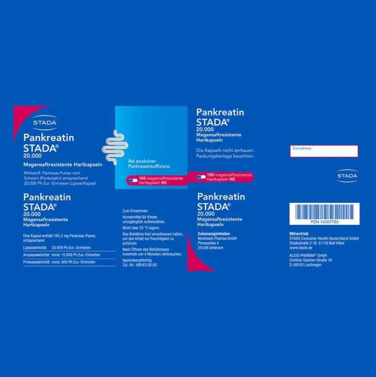 Pankreatin STADA® 20.000 magensaftresistente Hartkapseln. Wirkstoff: Pankreas-Pulver vom Schwein (Pankreatin) entsprechend 20.000 Ph.Eur.-Einheiten Lipase/Kapsel. Wird Zur Behandlung einer exokrinen Pankreasinsuffizienz angewendet. Hierbei produziert die Bauchspeicheldrüse nicht genügend Enzyme, um die Nahrung zu verdauen. Pankreatin STADA® kann bei Kindern, Jugendlichen und Erwachsenen angewendet werden. Die Behandlung mit Pankreatin STADA® verbessert die Symptome der exokrinen Pankreasinsuffizienz, einschließlich Stuhlkonsistenz (z.B. fettiger Stuhl), Bauchschmerzen, Flatulenz und Stuhlfrequenz (Durchfall oder Verstopfung). Wenn Sie sich nach 5 Tagen nicht besser oder gar schlechter fühlen, wenden Sie sich an Ihren Arzt. Zu Risiken und Nebenwirkungen lesen Sie die Packungsbeilage und fragen Sie Ihre Ärztin, Ihren Arzt oder in Ihrer Apotheke. Zulassungsinhaber: Nordmark Pharma GmbH, Pinnauallee 4, 25436 Uetersen. Mitvertrieb: STADA Consumer Health Deutschland GmbH, Stadastraße 2–18, 61118 Bad Vilbel. Mitvertrieb: ALIUD PHARMA® GmbH, Gottlieb-Daimler-Straße 19, D-89150 Laichingen. Stand: Februar 2021