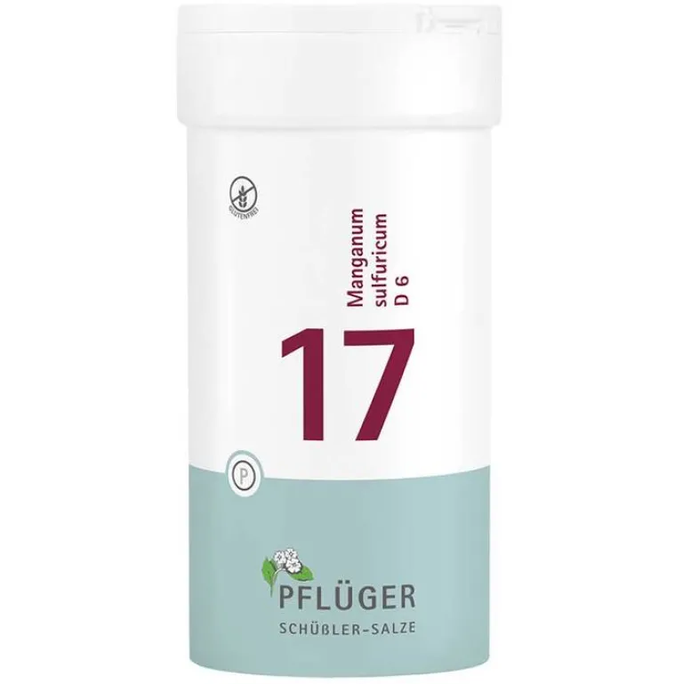 Biochemie Pflüger® Nr. 17 Manganum sulfuricum D6, Zusammensetzung: 1 Tablette enthält: Wirkstoff: Manganum sulfuricum Trit. D6 250 mg. Sonstige Bestandteile: Calciumbehenat (DAB), Kartoffelstärke. Registriertes homöopathisches Arzneimittel, daher ohne Angabe einer therapeutischen Indikation. Gegenanzeigen/Nebenwirkungen: Keine bekannt. Enthält Lactose. Packungsbeilage beachten. Zu Risiken und Nebenwirkungen lesen Sie die Packungsbeilage und fragen Sie Ihre Ärztin, Ihren Arzt oder in Ihrer Apotheke. Homöopathisches Laboratorium Alexander Pflüger GmbH & Co. KG 33378 Rheda-Wiedenbrück [email protected] www.pflueger.de
