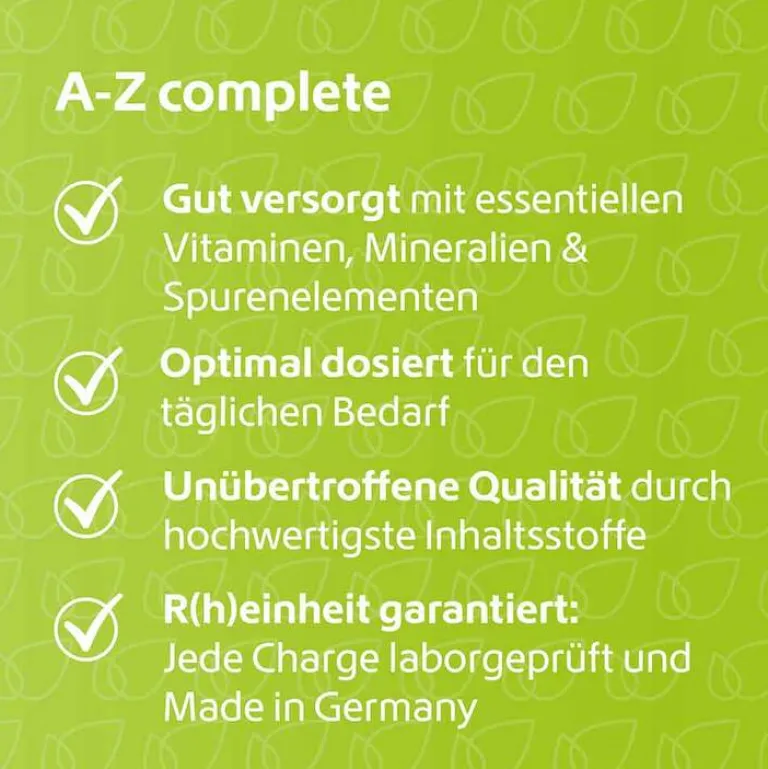 Das A-Z complete bietet eine umfassende Versorgung mit Vitaminen, Mineralstoffen und Spurenelementen – von Vitamin A bis Zink. Eine ausreichende Nährstoffversorgung ist wichtig für die optimale Funktion des Körpers. A-Z complete bietet eine ausgewogene Nährstoff-Kombination in einem ausgewogenen Verhältnis, um die Ernährung optimal zu ergänzen: Es unterstützt unter anderem das Immunsystem¹, das Nervensystem² sowie die Muskelfunktion³ und trägt zur Erhaltung der Sehkraft⁴, Haut⁵, Knochen und Zähne⁶ bei. Zudem ist A-Z complete vegan und enthält keine unnötigen Zusatzstoffe. Die Kapseln bieten eine Rundum-Versorgung für zwei Monate.