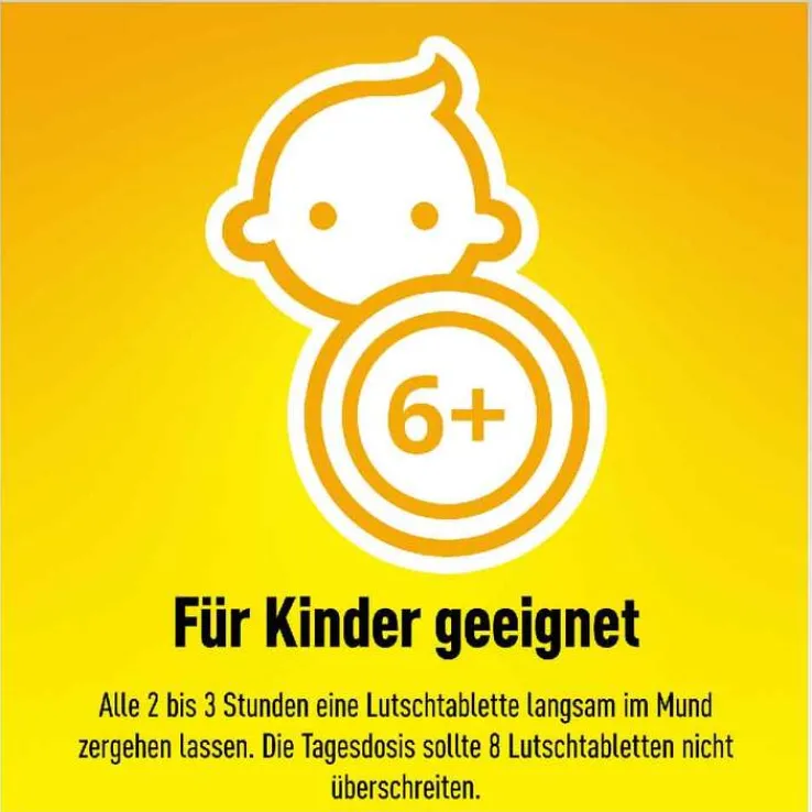 Falls ärztlich nicht anders verordnet, nehmen Kinder ab 6 Jahren und Erwachsene bei Bedarf alle 2-3 Stunden eine Lutschtablette, die sie langsam im Mund zergehen lassen. Die Tagesdosis sollte 8 Lutschtabletten nicht überschreiten.
