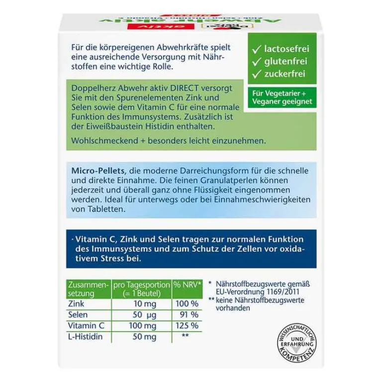 Durch ein modernes Herstellungsverfahren ist es gelungen, eine moderne und praktische Darreichungsform zu entwickeln. Doppelherz Abwehr aktiv Direct enthält seine wertvollen Nährstoffe in Form von Micro-Pellets. Den Portionsbeutel aufreißen, den Inhalt direkt auf die Zunge geben und die feinen Granulatperlen lösen sich in Sekundenschnelle auf.
