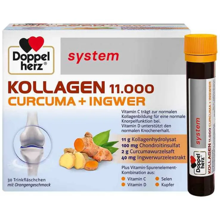Doppelherz System Kollagen 11.000 Curcuma + Ingwer enthält ausgesuchte Vitamine, Spurenelemente, Kollagenhydrolysat und Chondroitinsulfat. Zusätzlich sind Curcumawurzelsaft und Ingwerwurzelextrakt enthalten. Die Nährstoffe sind optimal aufeinander abgestimmt. Die Trinkampullen sind sofort trinkfertig und mit leckerem Orangen-Geschmack, also bestens für unterwegs geeignet.