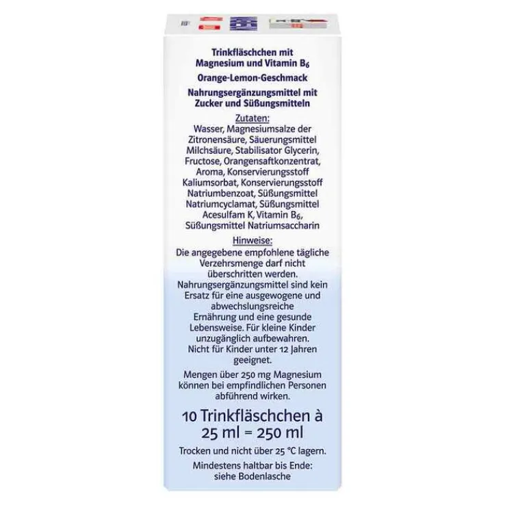 Wasser, Magnesiumsalze der Zitronensäure, Säuerungsmittel Milchsäure, Stabilisator Glycerin, Fructose, Orangensaftkonzentrat, Aroma, Konservierungsstoff Kaliumsorbat, Konservierungsstoff Natriumbenzoat, Süßungsmittel Natriumcyclamat, Süßungsmittel Acesulfam K, Pyridoxinhydrochlorid, Süßungsmittel Natriumsaccharin.
