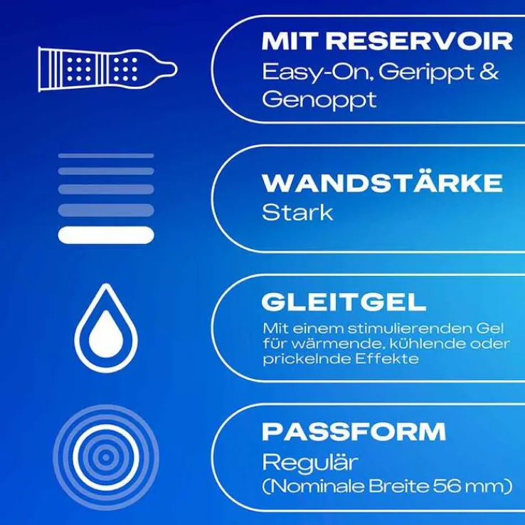 Die durex® Intense Kondome sind für zusätzliche vaginale Stimulation gemacht. Die gerippte und genoppte Textur sorgt für ein noch intensiveres Gefühl und das stimulierende Gel erzeugt wärmende, kühlende oder prickelnde Effekte. Sie haben eine nominale Breite von 56 mm (reguläre Passform) und sind mit viel Desirex-Gel befeuchtet – so wird der Sex für euch noch prickelnder und angenehmer. Die durex® Intense Kondome sind für alle Personen geeignet, die zusätzliche Stimulation beider Partner möchten. Die anatomische Easy-On-Form mit Reservoir sorgt für einen komfortablen Sitz. Dank der neuen Formel mit speziellen Inhaltsstoffen riechen die Kondome außerdem angenehm.