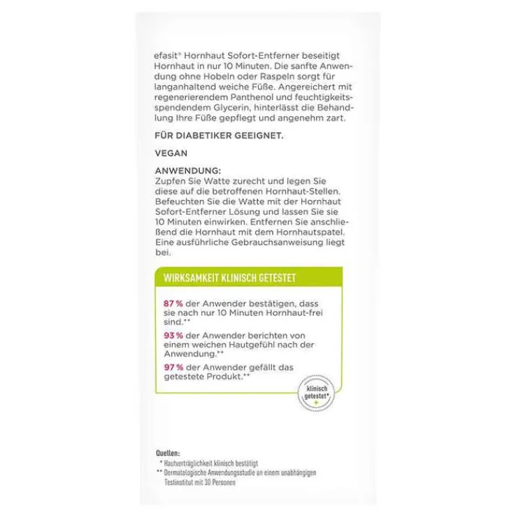 Efasit Hornhaut Sofort-Entferner beseitigt Hornhaut in nur 10 Minuten. Die sanfte Anwendung ohne Hobeln oder Raspeln sorgt für langanhaltend weiche Füße. Angereichert mit regenerierendem Panthenol und feuchtigkeitsspendendem Glycerin, hinterlässt die Behandlung Ihre Füße gepflegt und angenehm zart.
