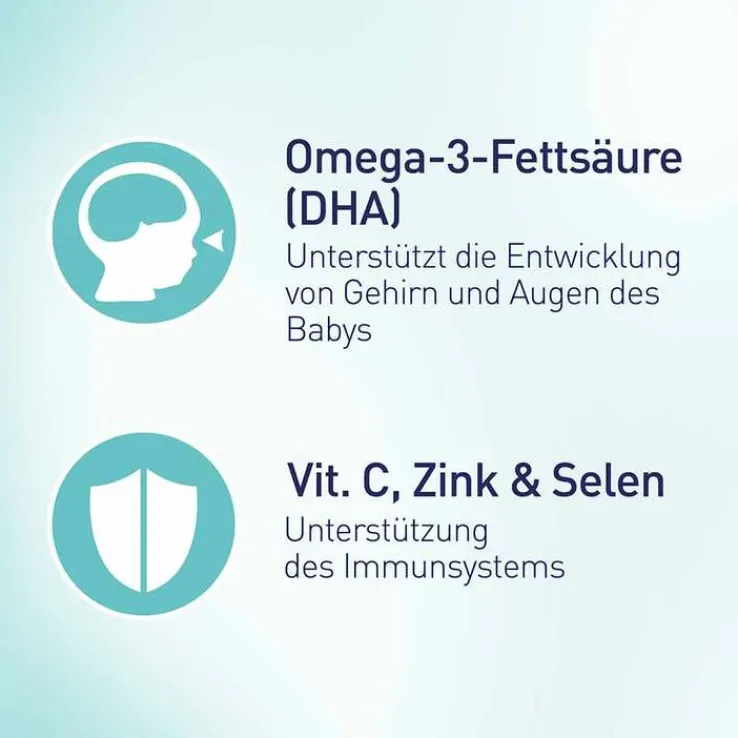 - die Omega-3-Fettsäure Docosahexaensäure (DHA) unterstützt die weitere Entwicklung des Gehirns und der Augen Ihres Kindes ¹