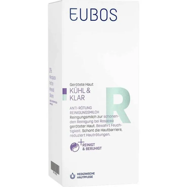 Die Eubos Kühl und Klar Anti-Rötung Reinigungsmilch ist ein medizinisches Pflegeprodukt zur pH-hautneutralen Reinigung bei Rosacea. Die Milch reinigt gründlich und hinterlässt die Haut spürbar weicher. Das enthaltene Bisabolol beruhigt gerötete Haut und natürliche Öle aus Jojoba, Hagebutte- und Pflaumenkern wirken rückfettend und pflegend. Der Phyto-Aktivstoffkomplex mit italienischer Immortelle hemmt Entzündungsvorgänge und stärkt die Gefäße. Er reduziert sichtbar Rötungen und Schwellungen.