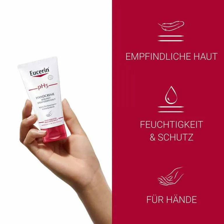 Die Eucerin pH5 Handcreme ist eine Handpflege, die besonders für die Bedürfnisse empfindlicher, trockener und strapazierter Haut geeignet ist. Die Hautpflege beruhigt strapazierte Haut, spendet 18h intensive Feuchtigkeit und hilft den Feuchtigkeitsverlust zu reduzieren – für ein spürbar weiches Hautgefühl.