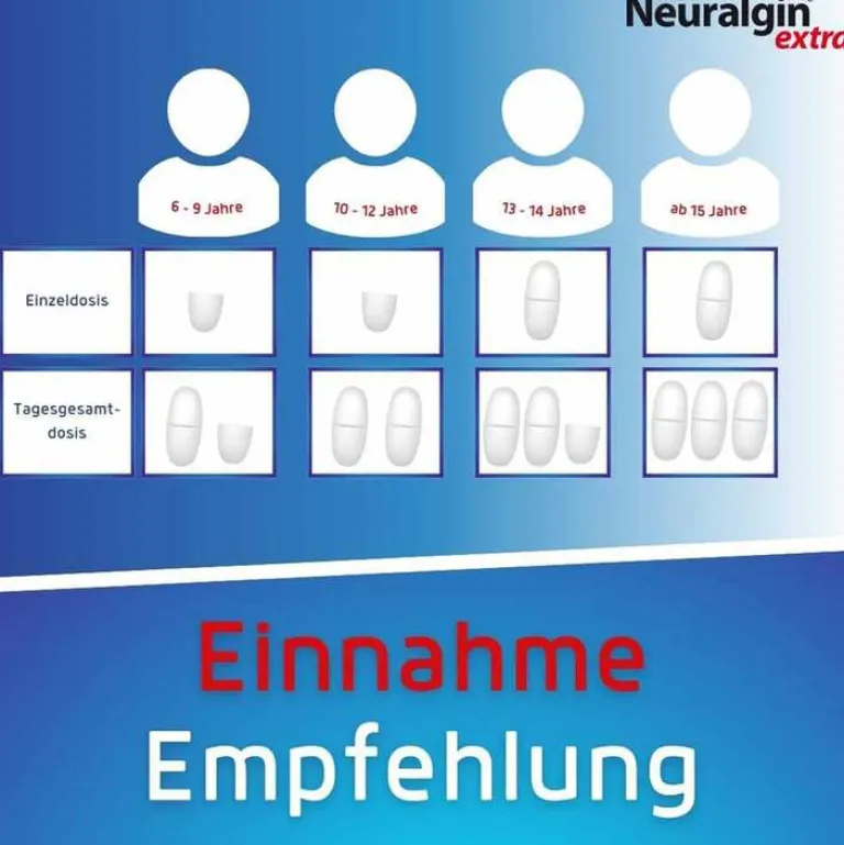 Neuralgin® extra kann schon von Kindern ab 6 Jahren und von Jugendlichen eingenommen werden. Bei leichten bis mäßig starken Schmerzen, wie z.B. Kopf-, Zahn- und Regelschmerz, kann Neuralgin® extra schnell Linderung verschaffen. Die Dosierung der Schmerztabletten erfolgt in Abhängigkeit von Körpergewicht bzw. Alter.