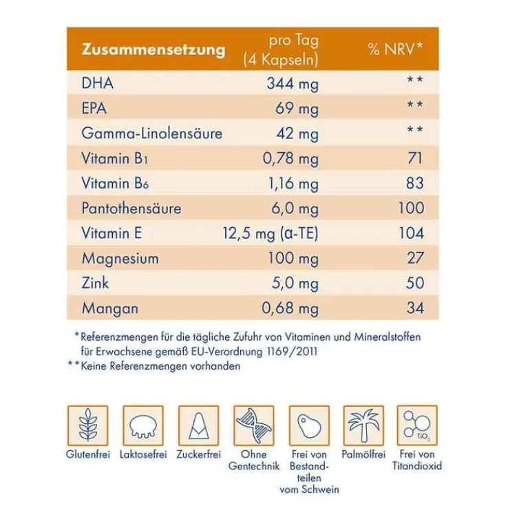Fischölkonzentrat mit Omega-3-Fettsäuren; Kapselhülle: Gelatine; Borretschsamenöl; Magnesiumoxid; Feuchthaltemittel: Glycerin, Sorbitol; Wasser; Trennmittel: Bienenwachs; Emulgator: Sonnenblumenlecithin; D-α-Tocopherol (Vitamin E); Zinkgluconat; Sonnenblumenöl; Calciumpantothenat; Zinkoxid; Farbstoff: Eisenoxid; Mangansulfat; Pyridoxin-Hydrochlorid (Vitamin B₆); Thiamin-Mononitrat (Vitamin B₁).