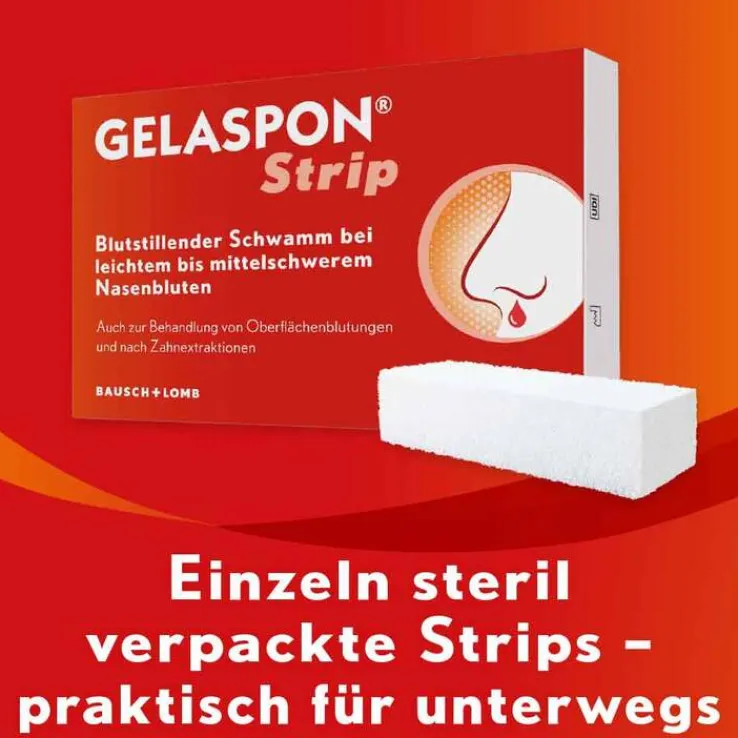 Die Funktionsweise von GELASPON® Strip beruht auf seiner feinporigen, porösen Schwammstruktur. Dadurch hat GELASPON® Strip ein hohes Saugvermögen für Blut und Wundsekrete. GELASPON® Strip kann zur Blutstillung bei leichtem bis mittelschwerem Nasenbluten, zur Versorgung oberflächlicher Wunden und nach einer Zahnextraktion verwendet werden.