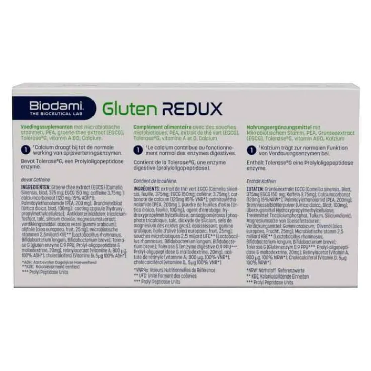 Grüntee-Extrakt (EGG) (Camelia sinensis Blatt); Calciumcarbonat; Füllstoff: Kartoffelstärke; Palmitoylethanolamid; Kapselhülle: Hydroxypropylmethylcellulose; Trennmittel; Magnesiumstearat; Mikrobiotische Stämme; Lactobacillus rhamnosus IQB2911, Bifidobacterium longum IQB2901, Bifidobacterium breve IQB0611; Prolyloligopeptidase-Glutenenzym; Olivenöl; Retinylacetat (Vitamin A); Cholecalciferol (Vitamin D)