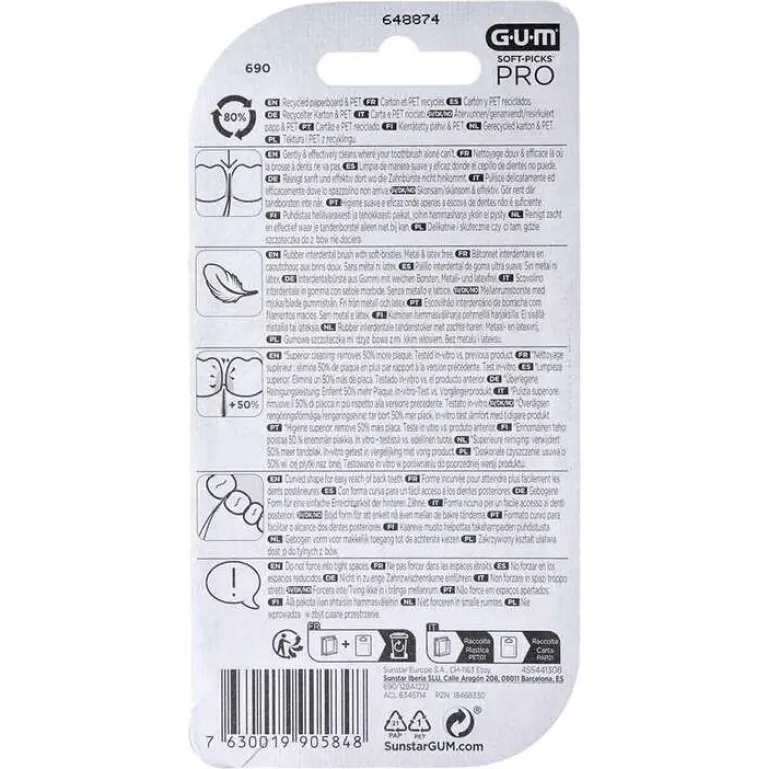 GUM Soft-Picks Pro ist die neueste Innovation im GUM Interdentalsortiment und eignet sich hervorragend für die tägliche Reinigung der Zahnzwischenräume vor dem Zähneputzen mit einer Zahnbürste. Der Kopf wurde neu gestaltet, ist ultraweich und reinigt 50% effektiver* zwischen den Zähnen, also in den Bereichen, die eine Zahnbürste nicht erreicht. Auch die hinteren Zahnzwischenräume werden durch die leicht gebogene Form einfach erreicht.