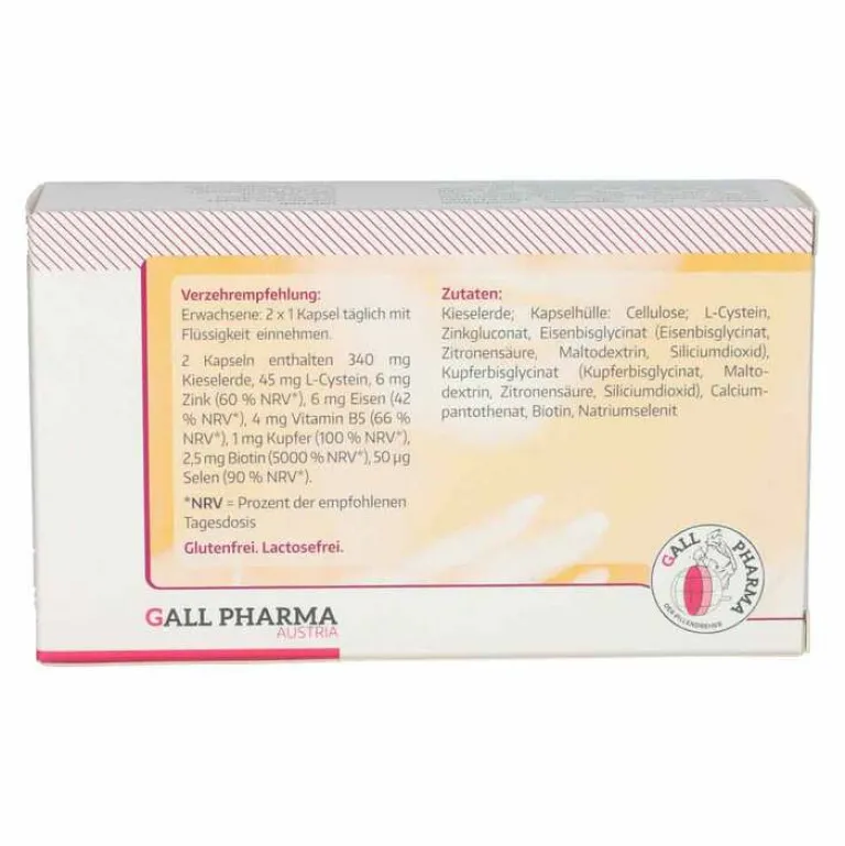 Kieselerde; Kapselhülle: Cellulose; L-Cystein, Zinkgluconat, Eisenbisglycinat (Eisenbisglycinat, Zitronensäure, Maltodextrin, Siliciumdioxid), Kupferbisglycinat (Kupferbisglycinat, Maltodextrin, Zitronensäure, Siliciumdioxid), Calciumpantothenat, Biotin, Natriumselenit.