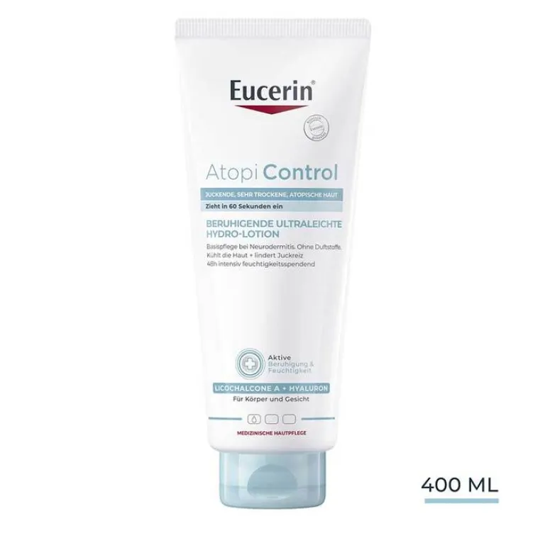 Die Eucerin AtopiControl beruhigende ultraleichte Hydro-Lotion ist eine täglich anzuwendende Basispflege, die speziell entwickelt wurde, um gereizte und juckende Haut zu beruhigen und intensiv Feuchtigkeit zu spenden. Mit der in der Neurodermitis Creme enthaltenen Kombination aus Licochalcone A (Süßholzwurzelextrakt), Hyaluronsäure und Ceramiden entsteht eine sofortige Linderung für juckende Haut, indem Juckreiz am ganzen Körper gemildert wird. Die Eucerin Lotion beruhigt zugleich bei Hautekzemen und sorgt für langanhaltendes Wohlbefinden der Haut. Bei regelmäßiger Anwendung der Hautpflege verbessert sich der Hautzustand spürbar, die Haut wird weicher und fühlt sich geschmeidiger an.