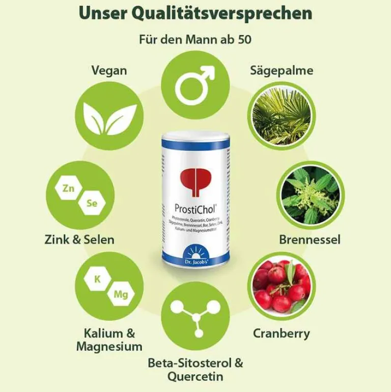 In ProstiChol sind die Mineralstoffe Kalium und Magnesium in Form von basischen Citraten enthalten. Weiterhin enthalten sind Extrakte aus Sägepalme, Cranberry und Brennnesselwurzel sowie das wertvolle Polyphenol Quercetin. Der Phytosterol-Komplex aus Pinien enthält beta-Sitosterol, Campesterol und Stigmasterol.