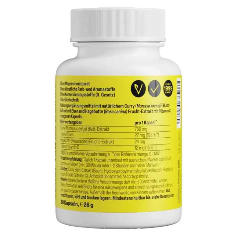 Curry Blatt-Extrakt (Eisen), Hydroxypropylmethylcellulose (Kapsel), Hagebutte Frucht-Extrakt (Vitamin C), Antioxidationsmittel: Ascorbylpalmitat.