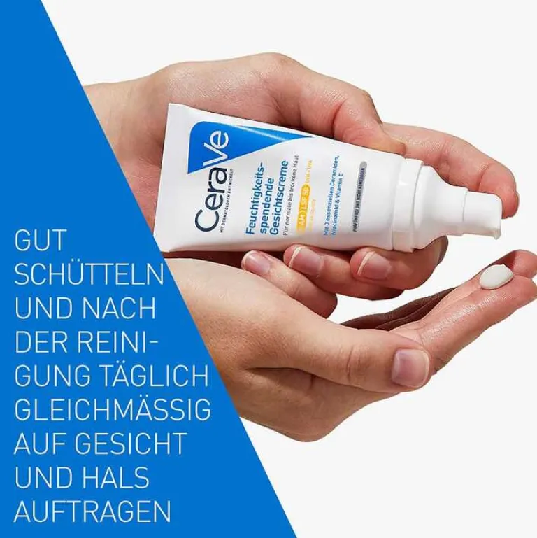 Die CeraVe feuchtigkeitsspendende Gesichtscreme mit LSF 50 kann als Tagescreme verwendet werden. Eine kleine Menge der Hautcreme wird morgens auf die gereinigte Gesichtshaut aufgetragen und anschließend leicht einmassiert. Die Augenpartie sollte dabei ausgespart werden.