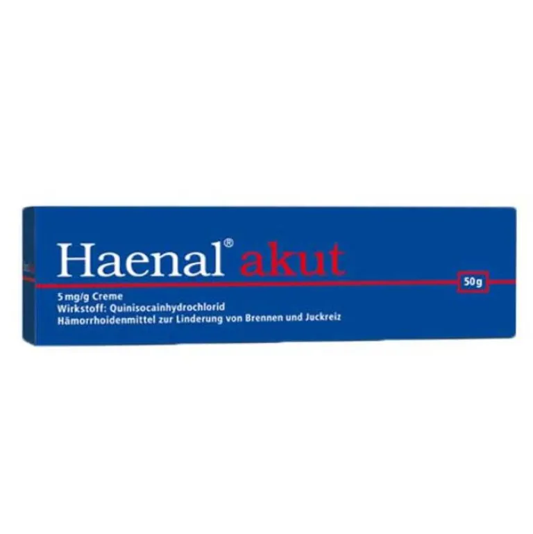 Haenal® akut. 5 mg/g Creme. Wirkstoff: Quinisocainhydrochlorid. Anwendungsgebiet: Linderung von Brennen und Juckreiz im Afterbereich. Warnhinweis: enthält Cetylalkohol und Parabene (Methyl-4-hydroxybenzoat [E 218] und Propyl-4-hydroxybenzoat [E 217]). Packungsbeilage beachten. Stand: 12.2020. Zu Risiken und Nebenwirkungen lesen Sie die Packungsbeilage und fragen Sie Ihre Ärztin, Ihren Arzt oder in Ihrer Apotheke.