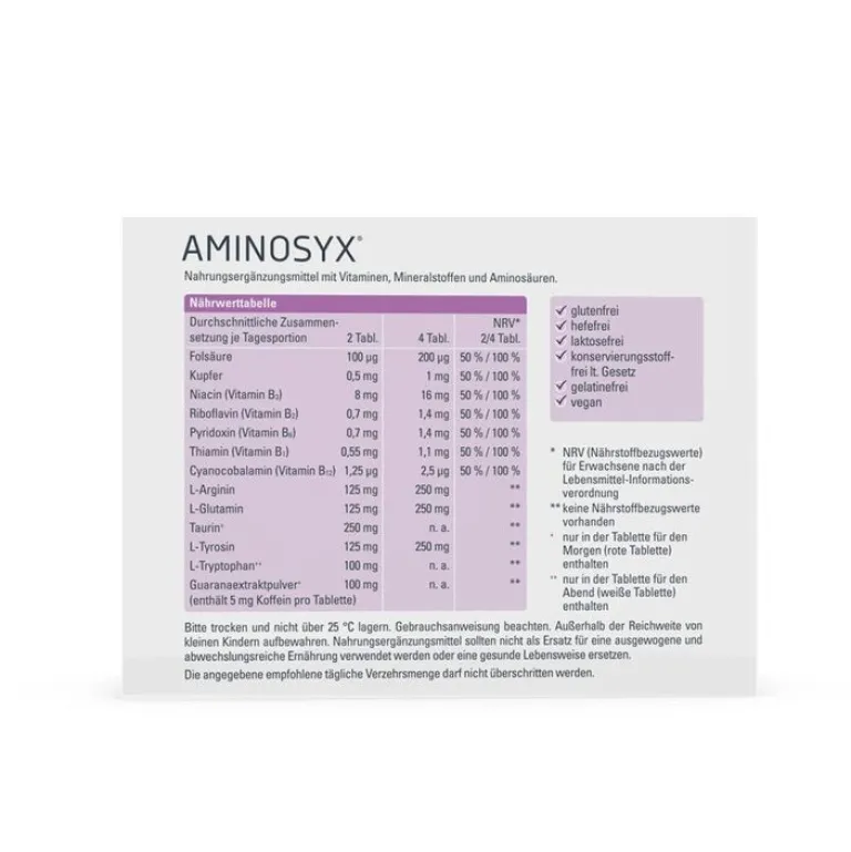 Enthält Koffein. Aminosyx ist nicht für Schwangere, Stillende sowie Kinder und Jugendliche geeignet. Bei der Einnahme von Antidepressiva sollte vor dem Verzehr Rücksprache mit dem Arzt oder Therapeuten gehalten werden. Es enthält pflanzliche Bestandteile und Naturstoffe, die gewissen Farbschwankungen unterliegen können. Leichte farbliche Unterschiede können daher auftreten und beeinflussen nicht die Qualität des Produktes.