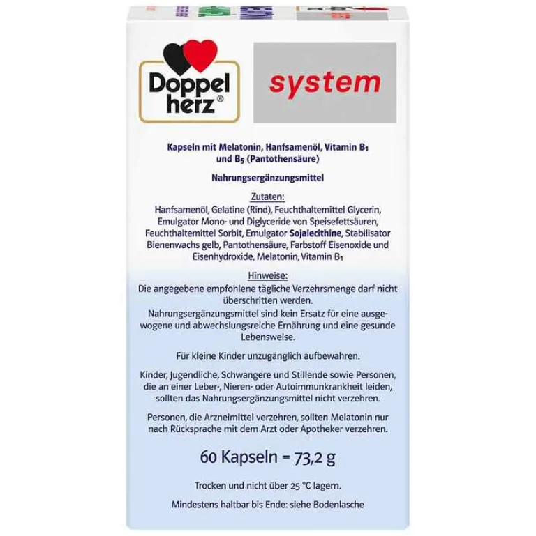 Hanfsamenöl, Gelatine (Rind), Feuchthaltemittel Glycerin, Emulgator Mono- und Diglyceride von Speisefettsäuren, Feuchthaltemittel Sorbit, Emulgator Sojalecithine, Stabilisator Bienenwachs gelb, Pantothensäure, Farbstoff Eisenoxide und Eisenhydroxide, Melatonin, Vitamin B1