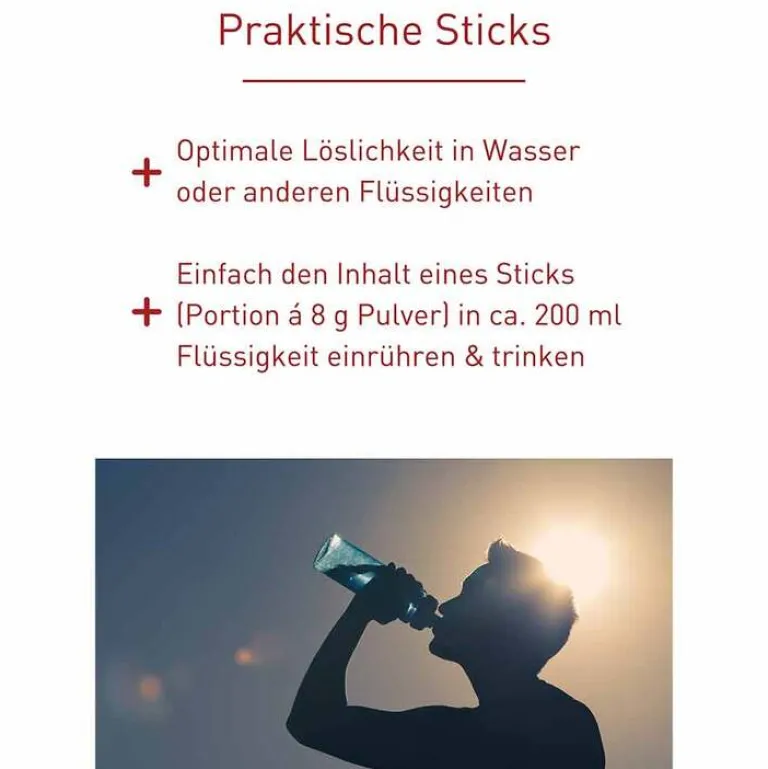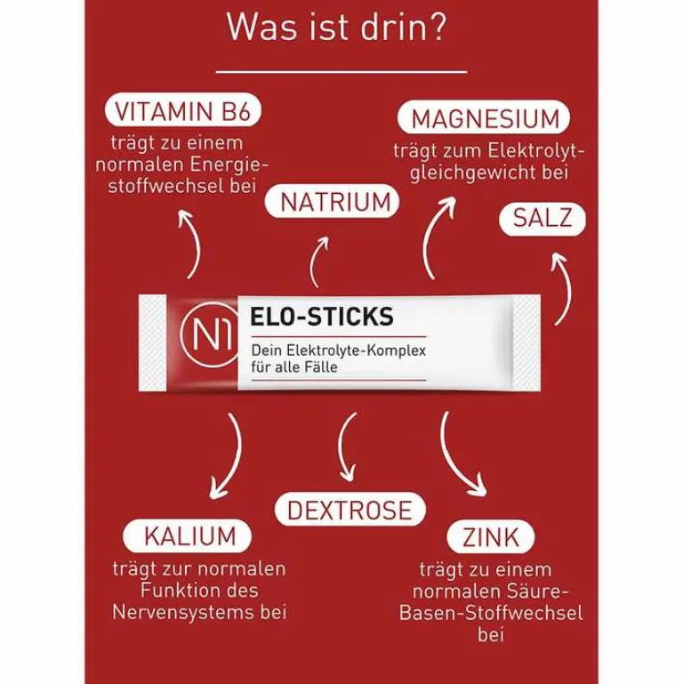 Die kleinen Sticks passen in jede Handtasche oder in die Hosen-/Jackentasche. Der N1 Elektrolyte-Komplex ist vegan und frei von unerwünschten Zusätzen. Das Pulver lässt sich schnell und einfach in Wasser auflösen und eignet sich optimal zum Ausgleich von Salz- und Wasserverlusten.* Die Sticks enthalten eine ausgewogene Mischung aus Salzen, Mineralstoffen & Glucose.