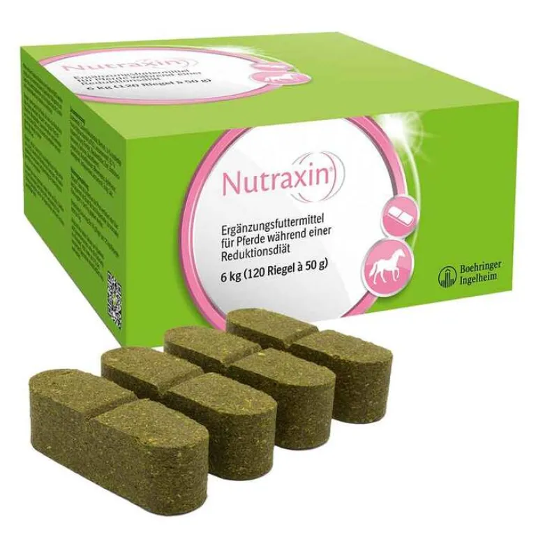 Nutraxin ist ein Ergänzungsfuttermittel Riegel für Pferde mit Spirulina-Algen, 8% kurzkettigen Fructo-Oligosacchariden (scFOS) und einem besonders hohen Gehalt an Biotin, Methionin und Zink.