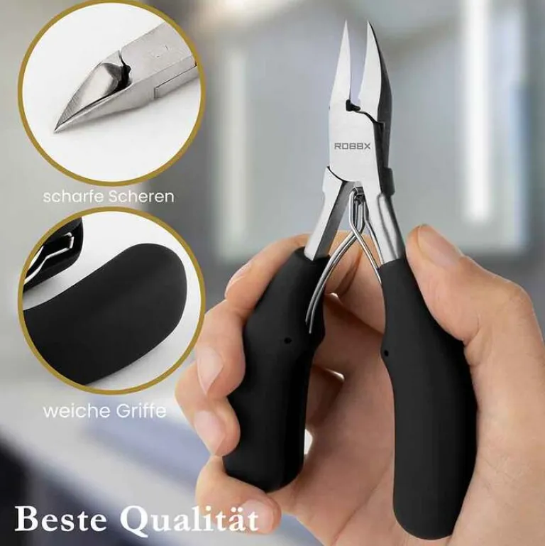 Die Robbx Profi Nagelzange ist sehr gut geeignet zur Pflege von Finger- und Fussnägeln. Die Nagelzange eignet sich sogar zum Entfernen von Nagelhaut. Sie besitzt weiche ergonomisch geformte Griffe und wird in einem stabilen Lederetui geliefert. Sie können die Nagelzange somit dekorativ im Badezimmer verwahren oder auf Reisen mitnehmen.
