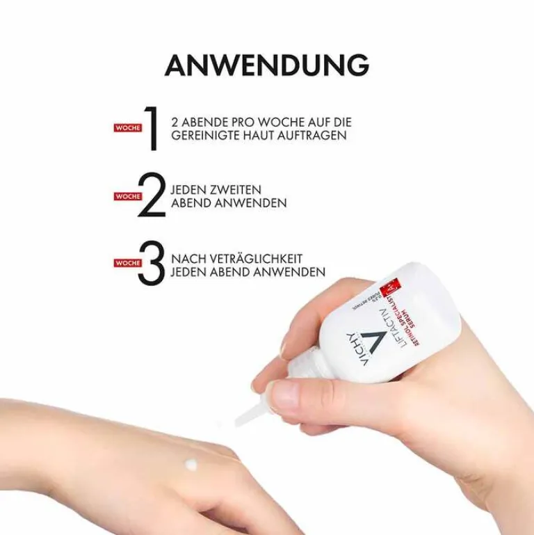 Bei guter Verträglichkeit ab der dritten Woche jeden Abend einige Tropfen des Serums auf die Haut geben.