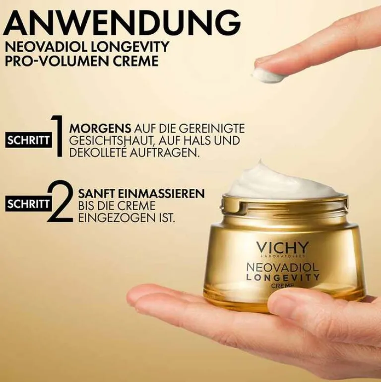 Vor der Anwendung der Vichy Neovadiol Longevity Pro-Volumen Creme das Gesicht gründlich reinigen und abtrocknen. Nun eine kleine Menge dem Tiegel entnehmen und auf das Gesicht auftragen. Anschließend mithilfe sanft kreisender Bewegungen von innen nach außen in die Haut einmassieren.