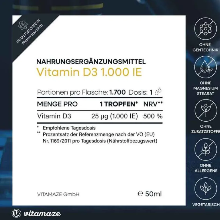 Wir empfehlen die Einnahme von einem Tropfen (1.000 IE) Vitamaze Vitamin D3 pro Tag. Sie können sich das Produkt direkt auf die Zunge tropfen oder das geschmacklose Öl Ihrer Nahrung hinzufügen.