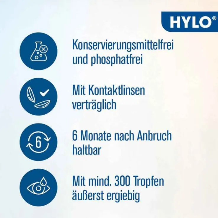 HYLO GEL® ist auf die speziellen Bedürfnisse von chronisch trockenen Augen und schweren Formen trockener Augen abgestimmt. Aufgrund des hohen Gehalts an Hyaluronsäure haften die hochviskosen Tropfen besonders gut auf der Augenoberfläche. Anhaltende und stärkere Beschwerden wie Juckreiz, Fremdkörpergefühl, gerötete und brennende Augen werden gelindert und das Auge wird dauerhaft vor Reizungen geschützt. Zudem gelten HYLO GEL® Augentropfen als gute Wahl, um den Heilungsprozess der Augen nach einer Operation zu unterstützen. Das praktische COMOD® System garantiert eine genaue Dosierung, hohe Ergiebigkeit von mindestens 300 Tropfen und lange Haltbarkeit von 6 Monaten. HYLO GEL® Augentropfen sind frei von Konservierungsmitteln und Phosphaten und deshalb sehr gut verträglich. HYLO GEL® befeuchtende Augentropfen sind nicht verschreibungspflichtig, aber verordnungsfähig. Bei bestimmten Indikationen (gemäß Anlage V Arzneimittelrichtlinie) können sie von der Ärztin bzw. vom Arzt verschrieben werden.