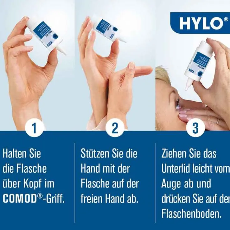 HYLO GEL® Augentropfen bieten eine intensive und langanhaltende Befeuchtung bei schweren und chronischen Formen des trockenen Auges. Dosieren Sie die Augentropfen individuell nach Ihrer Befindlichkeit bzw. den Empfehlungen Ihres Augenarztes bzw. -ärztin. Im Allgemeinen wird 3-mal täglich je 1 Tropfen HYLO GEL® in den Bindehautsack jeden Auges getropft. Bei stärkeren Beschwerden können die Augentropfen auch öfter am Tag angewendet werden. Falls Sie HYLO GEL® zusätzlich zu einer anderen medikamentösen Behandlung mit Augentropfen anwenden, halten Sie bitte einen Anwendungsabstand von mindestens 30 Minuten ein. HYLO GEL® ist in diesem Fall zuletzt zu verabreichen. Sollten Sie zusätzlich eine Augensalbe verwenden, streichen sie diese nach der Anwendung von HYLO GEL® in den Bindehautsack.