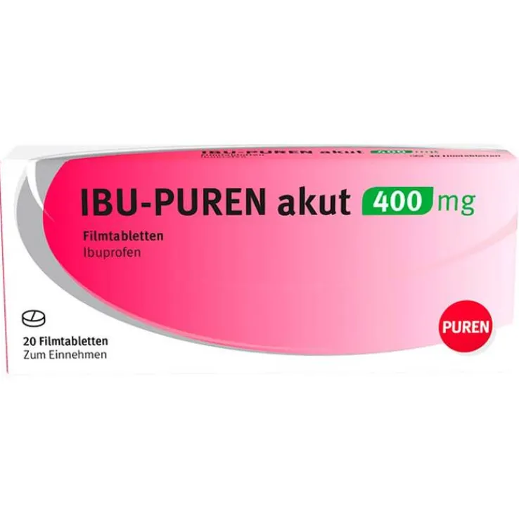 IBU-PUREN akut 400 mg Filmtabletten Wirkstoff: Ibuprofen. Anwendungsgebiete: kurzzeitige symptomatische Behandlung von leichten bis mäßig starken Schmerzen wie Kopfschmerzen, einschließlich Migränekopfschmerz, Zahnschmerzen, primärer Dysmenorrhoe, Fieber. Warnhinweis: Bei Schmerzen oder Fieber ohne ärztlichen Rat nicht länger anwenden als in der Packungsbeilage empfohlen! Zu Risiken und Nebenwirkungen lesen Sie die Packungsbeilage und fragen Sie Ihre Ärztin, Ihren Arzt oder in Ihrer Apotheke. Abgabestatus: Apothekenpflichtig. Stand der Information: Oktober 2020.