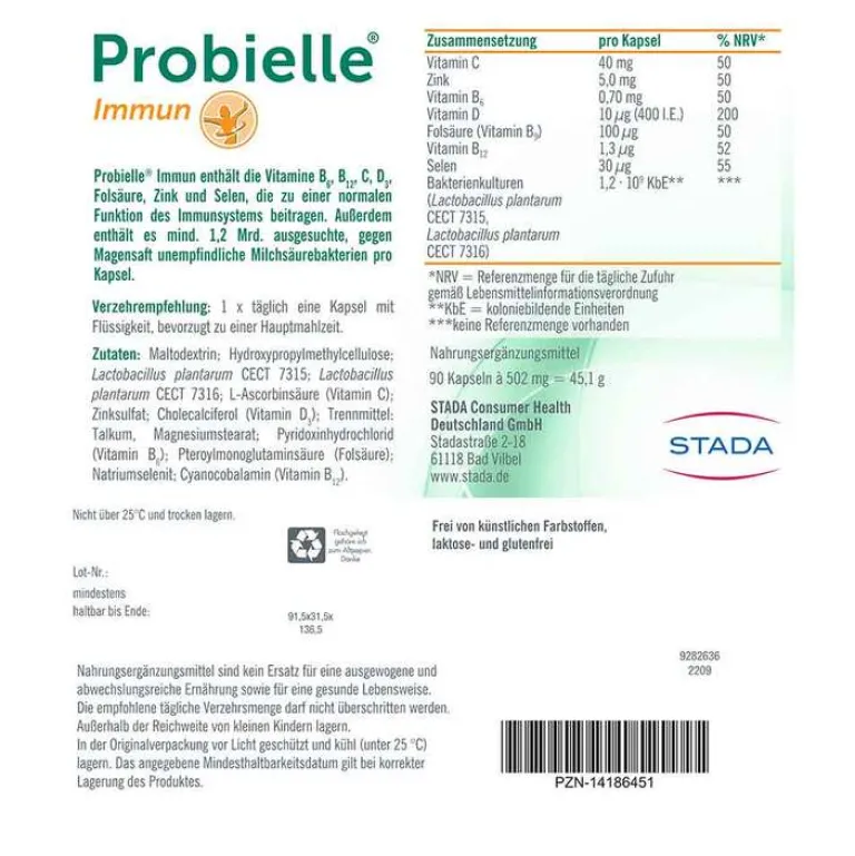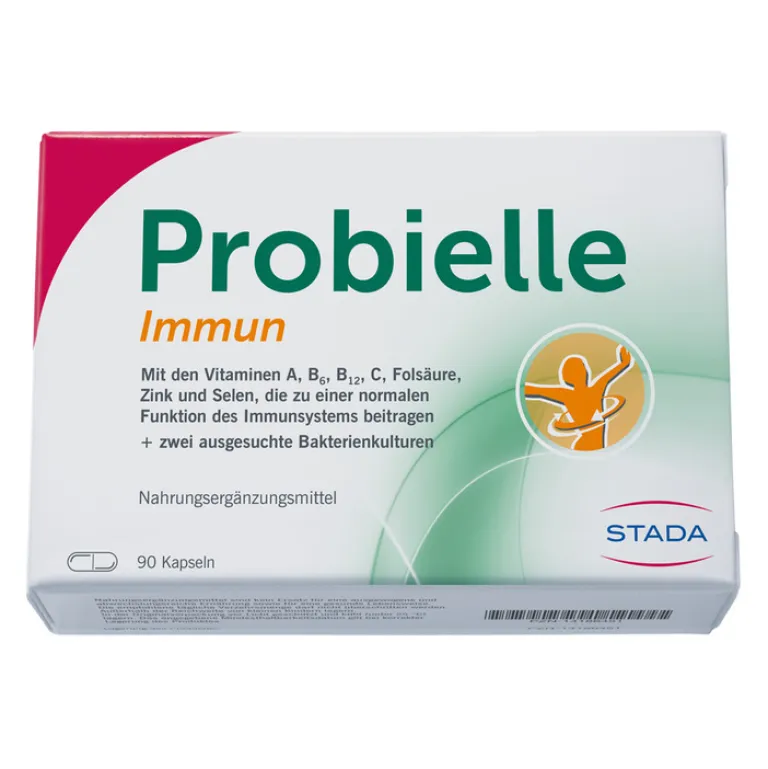 Probielle Immun ist ein Nahrungsergänzungsmittel mit den Vitaminen A, B6, B12, C und Folsäure sowie mit den Mineralstoffen Zink und Selen. Außerdem beinhaltet es folgende 2 Stämme mit mindestens 1,2 Milliarden ausgesuchten, gegen Magensaft unempfindlichen Milchsäurebakterien pro Kapsel: Lactobacillus plantarum CECT 7315 und Lactobacillus plantarum CECT 7316.