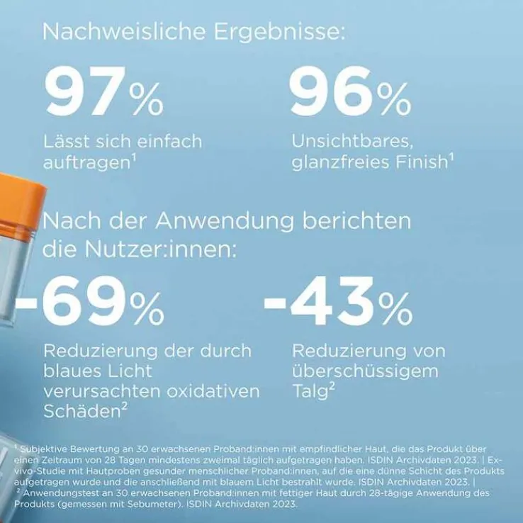 ² Ex-vivo-Studie mit Hautexplantaten von gesunden menschlichen Freiwilligen, Auftragen einer dünnen Produktschicht und anschließende Bestrahlung mit blauem Licht. ISDIN-Datenbestand 2023.