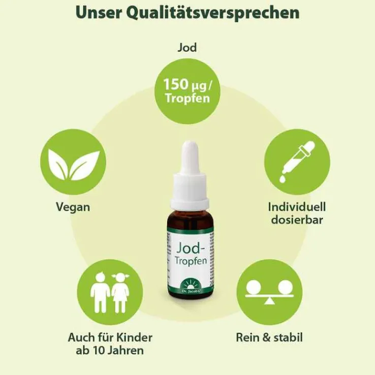 Dr. Jacob’s Jod-Tropfen enthalten pro Tropfen (1 Portion) 150 µg Jod. Wer 1–2 Jod-Tropfen am Tag zu sich nimmt, kann seine tägliche Versorgung sicherstellen und eine bestehende Unterversorgung korrigieren.